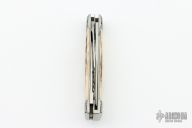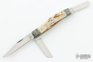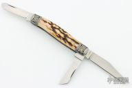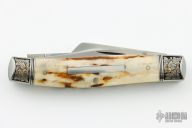 This Three-Blade Texas Jack by Bill Ruple features hand rub satin finished blades with nail nicks. The handle has engraved stainless steel bolsters with 24k gold inlays, stag covers with stainless steel escutcheon, stainless steel liners and springs. Half stop blade positioning on both blades, flush in all positions. Comes with a zippered case. Excellent Condition.