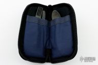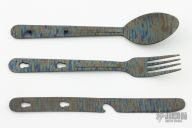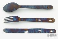 Flamed Titanium Silverware. Comes with a zippered case. Has a few light scuffs, otherwise excellent condition.