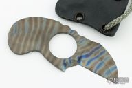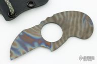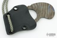 This neck knife features a flamed titanium chisel ground blade and handle, .127" blade stock and 1.063" blade depth, full tang construction. Comes with kydex sheath. Has a nick in the top edge, otherwise excellent condition.