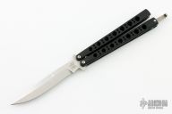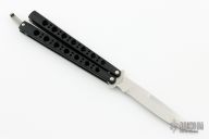 This Model 42 Balisong by Benchmade features a satin finished blade with swedge. The handle is comprised of integral skeletonized black coated titanium handles with spring latch on pommel. Comes with original nylon sheath, box and papers. Excellent condition.