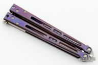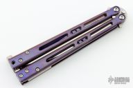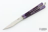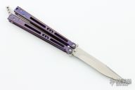 This Tempest Balisong from Jerry Hom features a satin finished balde with swedge. The handle is comprised of milled titanium handles with satin titanium backspacers and T latch. Includes a velcro case. Excellent condition. Only a handful were made in purple
