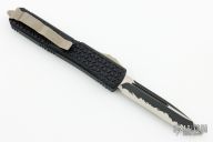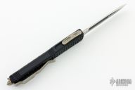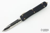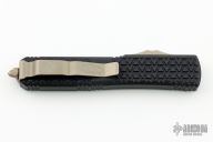 This Ultratech Katana by Microtech features a black/silver single edged blade with fullers. The handle has a black Tri-Grip aluminum handle with bronzed hardware and tip down clip. S/N 00069 and dated 08/2016. Excellent condition. Comes with original box and papers. Only 200 of these were made.