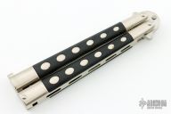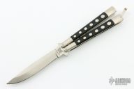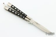 This International Series Utility Balisong has a satin finished stainless steel blade (marked 1985). Handle is steel with black plastic inlays. Comes with original box. Excellent condition.