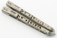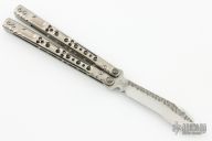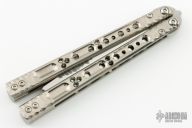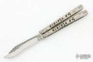 This Balisong by Palethius Designs features a hand rub satin finished blade with carved flats. The handles are milled and carved titanium with matching spacers. Comes with original box, hand tooled black leather sheath and papers. Excellent condition.