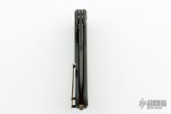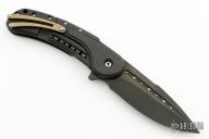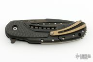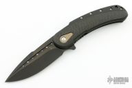 This limited edition Bodega flipper by Todd Begg Knives features a black DLC coated blade and titanium frame. Carbon Fiber inlays with cracked ice finished titanium backspacer, pocket clip and pivot island. Includes IKBS (Ikoma-Korth Bearing System) for smooth and fast opening that requires no wrist action. The Bodega has the new Begg Design Replaceable Lockbar which is designed to prevent overextension. Outstanding work. Comes with a zippered case. Has a couple light scuffs otherwise excellent condition.