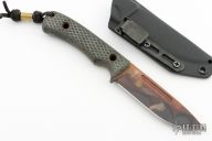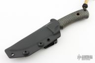 This K-1S fixed blade from TRC Knives has an apocalyptic finished drop point blade with fullers and notched thumbrest. 0.154" blade stock, 1.085" depth. Handle is comprised of sculpted black G-10 with lanyard hole over full tang construction. Includes kydex sheath with Ulti-Clip. Comes with the original box.  Excellent condition.