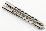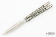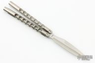 This Balisong by Vincenzo Fiore features a two-tone blade with blasted grinds and hand rub satin finished flats, false top edge. The handles are integral titanium channel construction that have been skeletonized. Latchless. Has a couple faint spots on the blade, otherwise excellent condition.