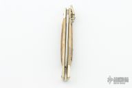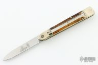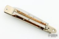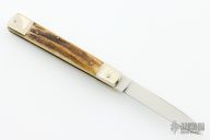 This Lever Lock Automatic by Hubertus Knives features a polished drop point blade. The handle is comprised of nickel silver double bolster and lever with stag scales over brass liners and steel backspacer. Has some light scratches, otherwise excellent condition.