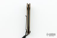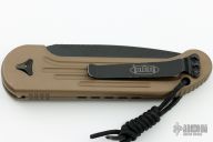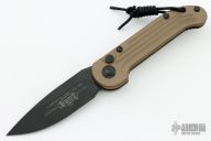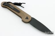 This LUDT side opening automatic by Microtech has a black finished blade with a standard edge and a contoured tan aluminum frame. Stainless steel clip. Dated 01/2016 and serial number 01924. Has a few scuffs/scratches, otherwise good condition.