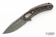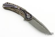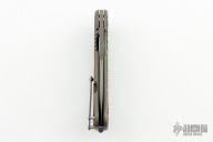 This Bodega 2.0 from Begg Knives features a dark tumble finished blade with swedge, notched thumbrest, fullers and flipper. The handle is comprised of a tumbled and anodized titanium frame with skeletonized and anodized titanium inlay over a notched and file worked titanium backspacer. Matching tip up clip and lanyard hole in pommel. Great blade seating, detent and lock up. Includes padded and zippered case. Excellent condition.