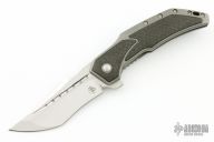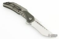 This Astio by Todd Begg features a mirror polished stonewashed tanto recurve blade with fullers and satin flats, RWL-34 blade steel. The handle has a stonewashed titanium frame with carbon fiber inlays, "jewel iced" zirconium backspacer, matching tip up clip with ceramic ball, and "jewel iced" titanium pivot collars. Rides on ceramic IKBS, nice detent, lockup and blade seating. Has a ceramic detent ball. Comes with COA and zipper case. Excellent condition.