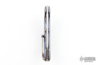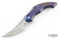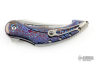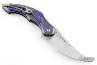 This Astio by Todd Begg features a mirror polished tanto recurve blade with fullers and satin flats. The handle has a polished timascus frame, jewel iced titanium backspacer and tip up clip with ceramic ball, jewel iced titanium pivot collars. Rides on ceramic IKBS, nice detent, lockup and blade seating. Has a ceramic detent ball. Excellent condition. Comes with zippered case and COA dated June 2019.