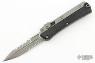 This Glykon by Microtech features a Apocalyptic double edged fully serrated blade with fullers and notched thumbrest. The handle has a black aluminum chassis with Apocalyptic  titanium overlays and tip down clip. Comes with original box and papers. Excellent condition. Dated 05/2023 and #1449.