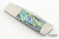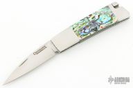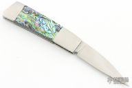 This Side lock by Frank Centofante features a hand rub satin finished blade with nail nick. The handle has dovetailed stainless steel boslters, abalone scales, fileworked stainless steel liners and a stainless steel backspacer. Nice lockup and blade seating. Comes with a nylon velcro sheath. Has some scratches, otherwise good condition.