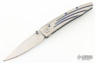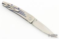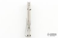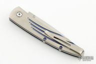 This William Henry is about style and performance. Sleek, light, tough, and elegant, each of these knives showcases the unmatched sharpness of ZDP-189 laminate blade steel with the durability of titanium handles. Sapphire inlays in the thumb stud and button lock. Titanium pocket clip for easy and secure carry. Has some light scratches, otherwise excellent condition. Comes with a leather pocket slip sheath.