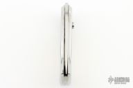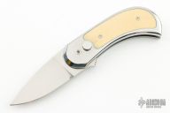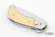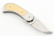This Dead Bolt Locking Flipper by Ron Richard features a hand rub satin finished blade with notched flipper. The Handle has a satin finished stainless steel frame with mammoth ivory inlays, stainless steel backspacer. Very smooth action. Blade is centered when closed. Has a few light scratches, otherwise excellent condition. Marked "RON RICHARD 14" inside backspacer.