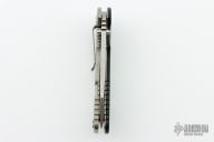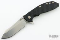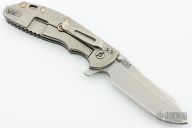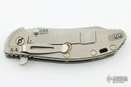 This XM-24 by Rick Hinderer features a tumble finished skinner style blade with swedge, dual thumb studs, notched thumb rest and flipper. The handle is comprised of a textured black G-10 scale over titanium liner on the "A" side and a tumbled titanium lock side over titanium barrel spacers. The tumbled titanium pocket clip is reversible for tip up/down, right hand carry. Includes original box. Has a couple light scratches, otherwise excellent condition.