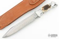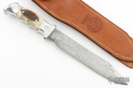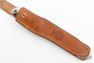 This Workman by Rudy Ruana features a satin finished blade with false top edge, .185" blade stock and 1.236" blade depth, hidden tang construction. The handle is cast from aluminum with elk inserts, guard has "M" stamp which signifies it was made by Rudy Ruana. Comes with brown leather sheath.  Oxidation is visible on the blade.  Has some scratches, otherwise good condition for its age.