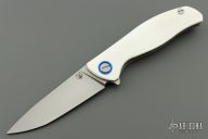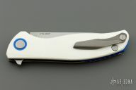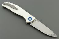 This F3 Flipper from Shirogorov Knives has a tumble finished flat ground drop point blade with notched flipper. Handle has white G-10 scales and backspacer, tumbled titanium tip up clip and liners. Recessed lanyard bail. Blue G10 collars and backspacer. Dead center blade seating, excellent detent and lockup. Original box and COA. Excellent condition.