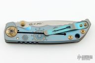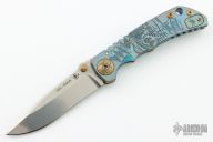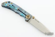 This Harsey framelock folder by Spartan Blades features a stonewashed drop point S45VN blade with dual thumbstuds and a notched thumbrest. The handle has an anodized titanium frame with a laser engraving a tip up titanium clip and filler tab. Has nice detent, lockup, and blade seating. Comes with original box. Excellent condition.