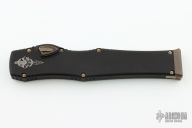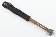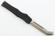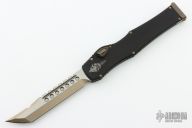 This Halo VI features a bronzed Hellhound tanto blade with satin flats, fullers and notched spine. Its handle is made from black Mil-Spec anodized alloy with bronzed hardware. The charging handle comes marked with the Microtech logo and date of creation along with the serial number. Microtech's Halo VI sets itself apart from previous models with added safety features and an improved charging handle mechanism. The firing button has been upgraded with an integrated safety to prevent accidental deployment. Its upgraded charging handle is built with dual pivoting latches that create a secure seal in the closed position. Comes with original box and papers. Dated 09/2018 and #003. Excellent condition.