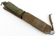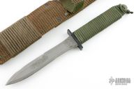 This PB-3W by EK Knives features a bead blasted blade with sharpened top edge, .150" blade stock and .966" blade depth, hidden tang construction. The handle has a black stainless steel guard and green paracord wrapped handle. Comes with nylon sheath. Has some scuffs, otherwise excellent condition.