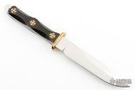 The M5 is the Bowie in the M-series. The handle is black linen micarta with brass "X" head pins. Brass double guard Full tang construction with thickness of .186" and depth of 1.260". Tang extends 3/4" at the butt with a lanyard hole. Has a false top edge. Excellent condition. #14 of 25