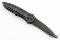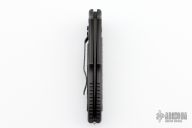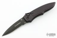 The Cobra features a black DLC finished 154-CM steel modified spear point blade with a partially serrated edge. The machined 6061 aluminum body is anodized black with raised texture on the front and back that feels excellent in the hand and ensures a good grip. Includes a glass breaker tip. All the hardware is black including the tip-down carry pocket clip. The sliding safety on the knife's front scale locks the knife, both open and closed. The action is exceptional on the Cobra and the lock-up is solid! Comes with original box. Excellent condition.