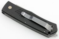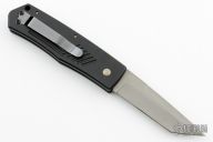 This Corby Tanto Auto (1 of 200) has a bead blasted 154 CM stainless steel tanto blade with false top edge. Handle is black anodized aluminum with safety auto button, milled ribs, titanium spacer, black titanium tip up clip, and lanyard hole. Has some light scuffs, otherwise excellent condition. Comes with original box.
