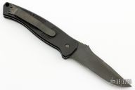 This SigTac auto features a black clip point blade with notched thumbrest and a false top edge. The handle has a black aluminum frame and black tip up stainless steel clip. Excellent condition.