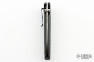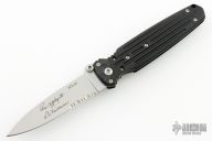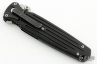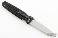 This combat folder by Gerber features a bead blasted spear-point partially serrated blade with dual thumb-studs and a notched thumb-rest. This knife also has a full flat grind which is less common than the typical dagger style grinds. Has a black composite handle with a stainless steel liner and safety that locks the blade in the open position. Has a couple scuffs on the clip, otherwise excellent condition.