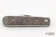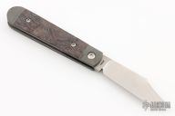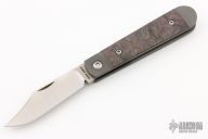 This Little Bro Jack slipjoint model by Jack Wolf Knives features a satin finished clip point blade with nailnick. The handle has integral bead blast finish pinched and fluted titanium bolsters and liners, carbon fiber scales with a stainless spring. Comes with box, metallic tube with Sean Tiffany artwork, leather slip, sticker and microfiber cleaning cloth. New from Maker!