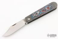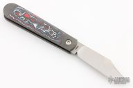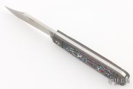 This Little Bro Jack slipjoint model by Jack Wolf Knives features a satin finished clip point blade with nailnick. The handle has integral bead blast finish pinched and fluted titanium bolsters and liners, carbon fiber scales with a stainless spring. Comes with box, metallic tube with Sean Tiffany artwork, leather slip, sticker and microfiber cleaning cloth. New from Maker!