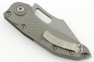 This Stitch Auto by Microtech Knives features an Apocalyptic finished blade and false top edge, notched thumb and finger rests. The handle has a "Natural Clear" milled aluminum handle with a bead blasted titanium backspacer and a bead blasted stainless steel clip, tip up carry, lanyard hole at the butt. Comes with original box and papers. S/N of 14280 and dated 08/2023. Excellent Condition.