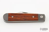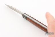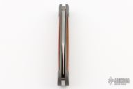 This Little Bro Jack slipjoint model by Jack Wolf Knives features a satin finished clip point blade with nailnick. The handle has integral bead blast finish pinched and fluted titanium bolsters and liners, rosewood scales with a stainless spring. Comes with box, metallic tube with Sean Tiffany artwork, leather slip, sticker and microfiber cleaning cloth. New from Maker!