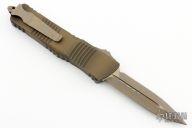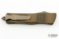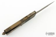 This Combat Troodon from Microtech Knives features a bronzed Apocalyptic double edged spear point blade with fully serrated top edge. The handle has an aluminum frame with bronzed hardware and tip down clip. Glass breaker and lanyard bail on pommel. Includes original box and papers. S/N of 153 and dated 07/2023. Excellent condition.