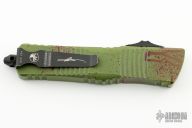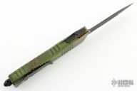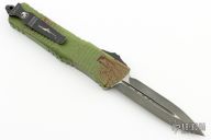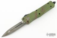 This Combat Troodon OTF automatic by Microtech knives features a double edged blade, and an aluminum handle with black hardware, tip down carry. Glass breaker. S/N 224. Dated 07/2023. Comes with original box and papers. Excellent condition.