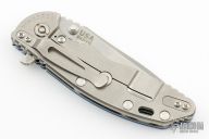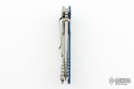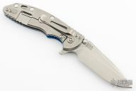 This XM-18 3.5" flipper by Rick Hinderer features a stonewashed blade with notched thumbrest and flipper. The handle has a stonewash titanium frame with a blue/black G-10 scale, a tip up or down reversible titanium clip and filler tab, lanyard hole at the butt. Comes with original box and extra hardware. New condition.
