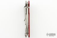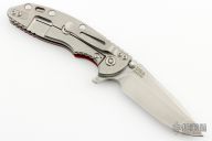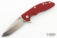 This XM-18 3.5" flipper by Rick Hinderer features a stonewashed blade with notched thumbrest and flipper. The handle has a stonewash titanium frame with a red G-10 scale, a tip up or down reversible titanium clip and filler tab, lanyard hole at the butt. Comes with original box and extra hardware. New condition.
