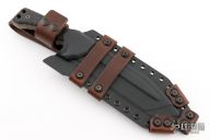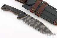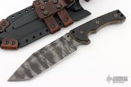 This M-32 by Miller Bros Blades features a tanto blade with fullers and notched thumbrest and tang, .320" blade stock 2.216" blade depth, full tang construction. The handle has black G-10 scales, lanyard hole, extended tang. Comes with a kydex/leather sheath. New condition.