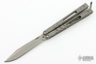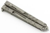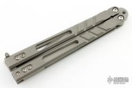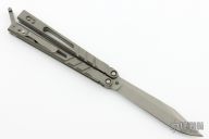 This Alpha Beast Balisong 3.0 from Blade Runner Systems (BRS) features a tumble finished clip point blade. The handle has a milled and tumbled titanium with T latch on pommel. Comes with original box and papers. Excellent condition.