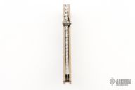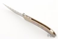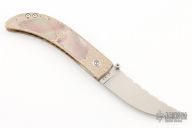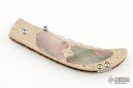 This Interframe Linerlock by Steve Jernigan features a hand rub satin finished blade with fileworked spine and dual thumbstuds, stamped "EE18" on B-side of ricasso. Handle has mokume scales with black lip pearl inlays, stainless steel backspacer. Nice detent, lockup and blade seating. Very smooth and classy little knife. Excellent condition.
