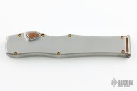 This Marfione custom Halo VI has a mirror polished tanto blade with ironwood inlays. The handle is made from double vapor blasted stainless steel with bronzed titanium hardware, and has no integrated safety on the push button, push button has ironwood inlay. The charging handle comes marked with the Marfione Dagger and dated 12/2020. Has ironwood inlay in the charging handle and button. Comes with original box, zippered case and COA. Excellent condition. Microtech's Halo VI sets itself apart from previous models with added features and an improved charging handle mechanism. Its upgraded charging handle is built with dual pivoting latches that create a secure seal in the closed position. Dated 12/2020 and s/n 008.