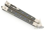 This knife features a satin finished recurve blade with false top edge. The handles are titanium with carbon fiber overlays and black micarta spacers, carbon fiber T-latch. #10 on blade, 20 were made. Has some light scratches, great condition otherwise.