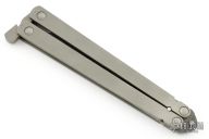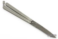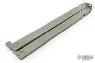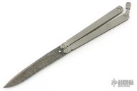 This balisong by Reese Weiland has a Damascus blade. The handles are bead blast finish titanium with a stainless steel latch at the butt. Comes with a zippered case. Has some light scuffs and a couple scratches, otherwise excellent condition.