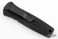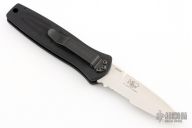 This 3550 Mel Pardue designed side opening auto from Benchmade has a satin finished spear point partially serrated blade with a false top edge. Handle is matte black finished aluminum with milled contours, spine-thumb safety button, black stainless steel tip down clip, and lanyard hole. Includes the original box and papers. Excellent Condition.