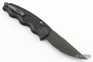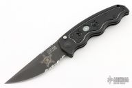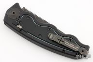 This SOG-TAC Auto has a black finish upswept blade with notched thumb rest and partial serrations. Handle is black anodized aluminum with safety, lanyard hole, and stainless steel tip up clip.  Black G10 inlays.    Includes the original box and papers.  Excellent Condition.