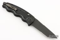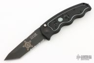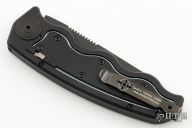 This SOG-TAC Auto has a black finish tanto blade with notched thumb rest and partial serrations. Handle is black anodized aluminum with safety, lanyard hole, and stainless steel tip up clip.  Black G10 inlays.    Includes the original box and papers.  Excellent Condition.