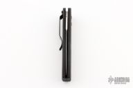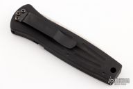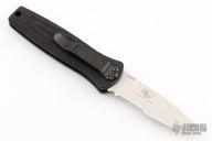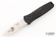 This 3550 Mel Pardue designed side opening auto from Benchmade has a satin finished spear point partially serrated blade with a false top edge. Handle is matte black finished aluminum with milled contours, spine-thumb safety button, black stainless steel tip down clip, and lanyard hole. Includes the original box and papers. Excellent Condition.