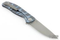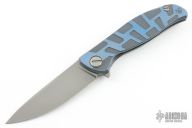 This F95T by Shirogorov Knives features a stonewashed blade with a notched thumbrest and flipper. The handle has a blue anodized and milled titanium frame with matching titanium backspacer and tip up clip. Nice detent, lockup and blade seating. Has MRBS. Comes with original box and COA. Excellent condition.